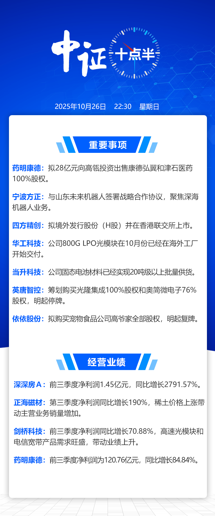 【中证十点半】药明康德拟28亿元向高瓴投资出售两家公司;上市公司三季报密集披露