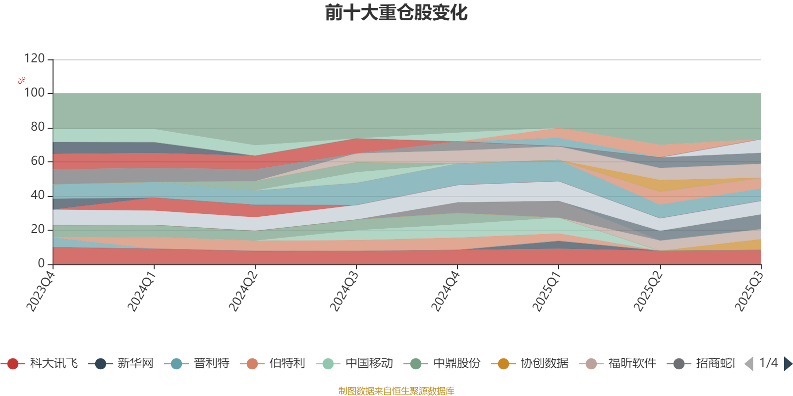 该基金持股集中度较高,近2年前十大重仓股集中度长期超过60%。截至2025年三季度末,基金十大重仓股分别是紫金矿业、科大讯飞、恒瑞医药、沪电股份、北方华创、金山办公、协创数据、海光信息、工商银行、福昕软件。