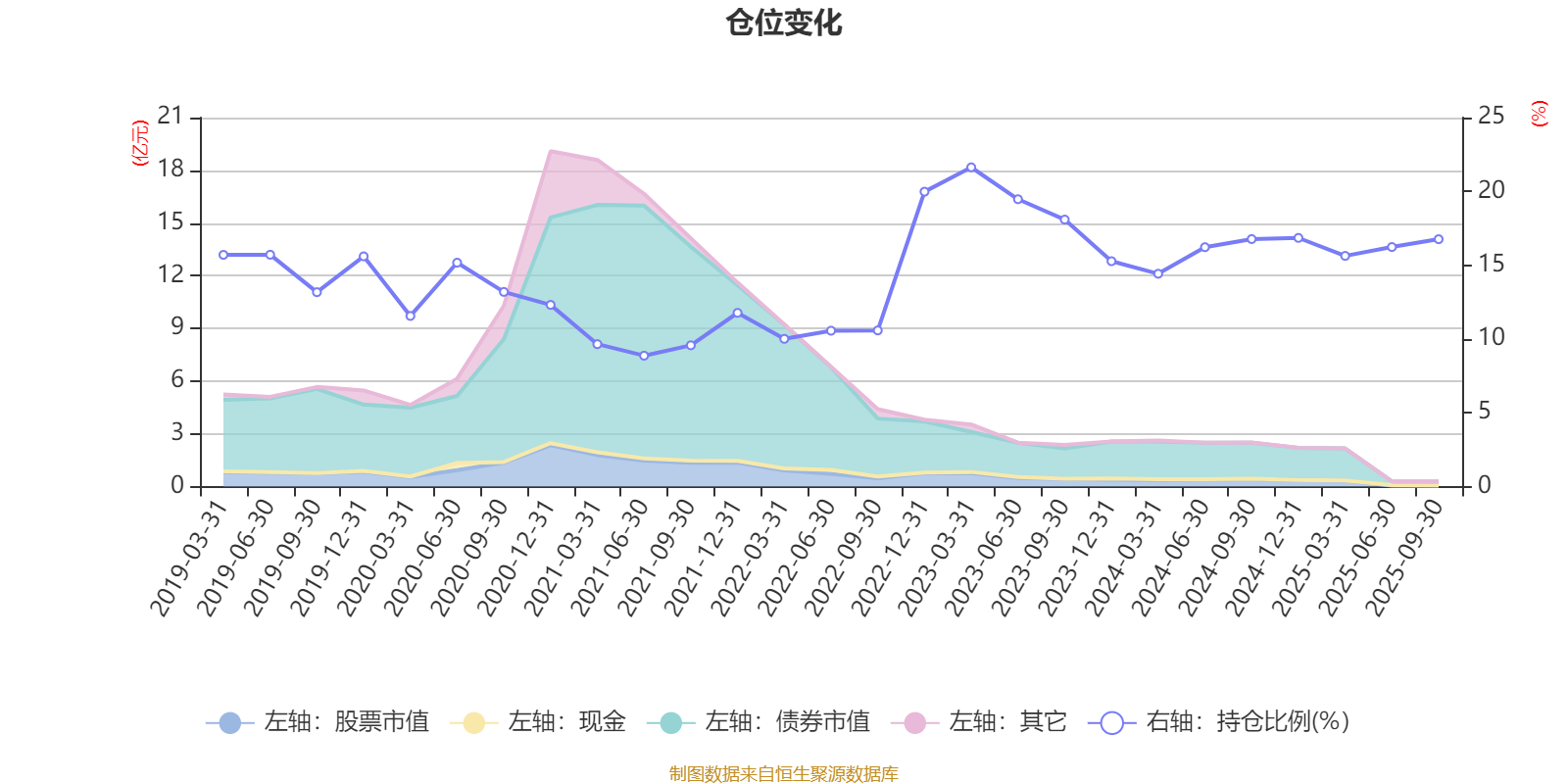 据定期报告数据统计,近三年平均股票仓位为17.28%,同类平均为72.18%。2023年一季度末基金达到21.63%的最高仓位,2021年上半年末最低,为8.87%。