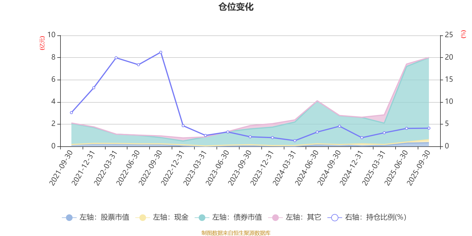 据定期报告数据统计,近三年平均股票仓位为3.08%,同类平均为19.03%。2022年三季度末基金达到21.21%的最高仓位,2024年一季度末最低,为1.31%。