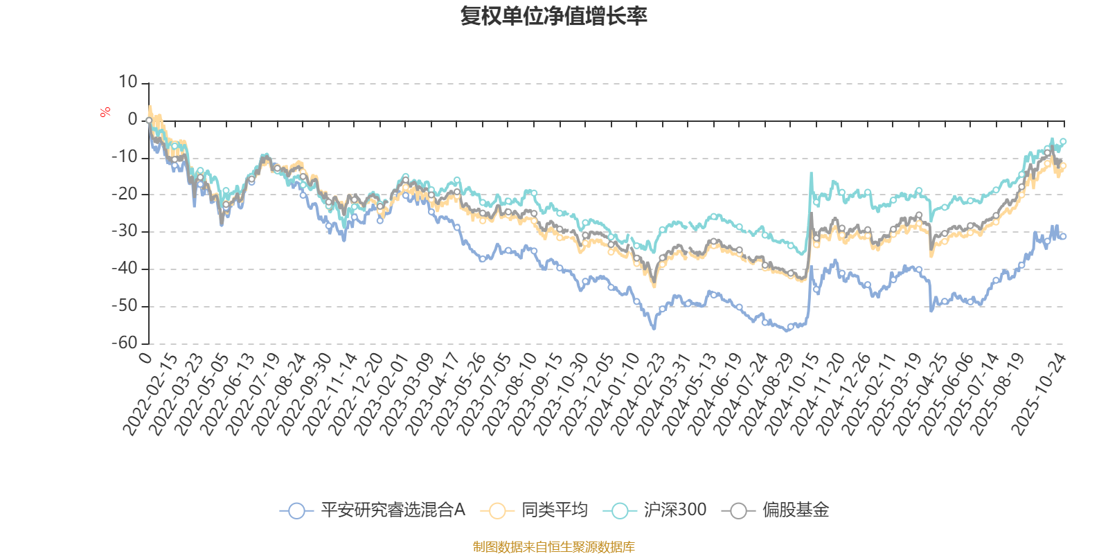 截至10月24日,平安研究睿选混合A近三个月复权单位净值增长率为14.85%,位于同类可比基金120/265;近半年复权单位净值增长率为34.38%,位于同类可比基金86/265;近一年复权单位净值增长率为20.37%,位于同类可比基金183/265;近三年复权单位净值增长率为-0.59%,位于同类可比基金205/253。
