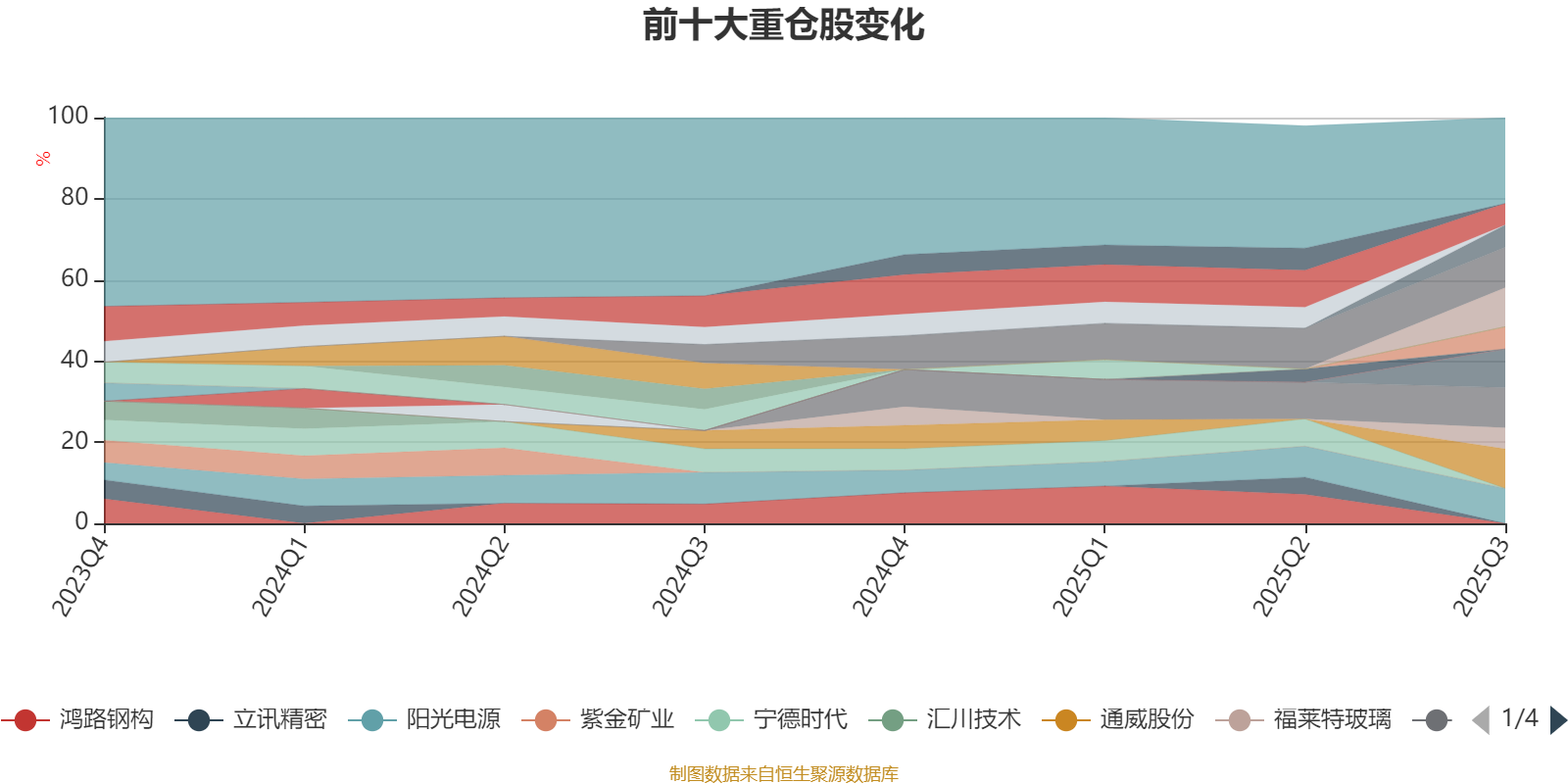 该基金持股集中度较高。截至2025年三季度末,基金十大重仓股分别是协鑫科技、信义光能、通威股份、弘元绿能、晶澳科技、阳光电源、晶科能源、天合光能、小鹏汽车-W、福莱特玻璃。
