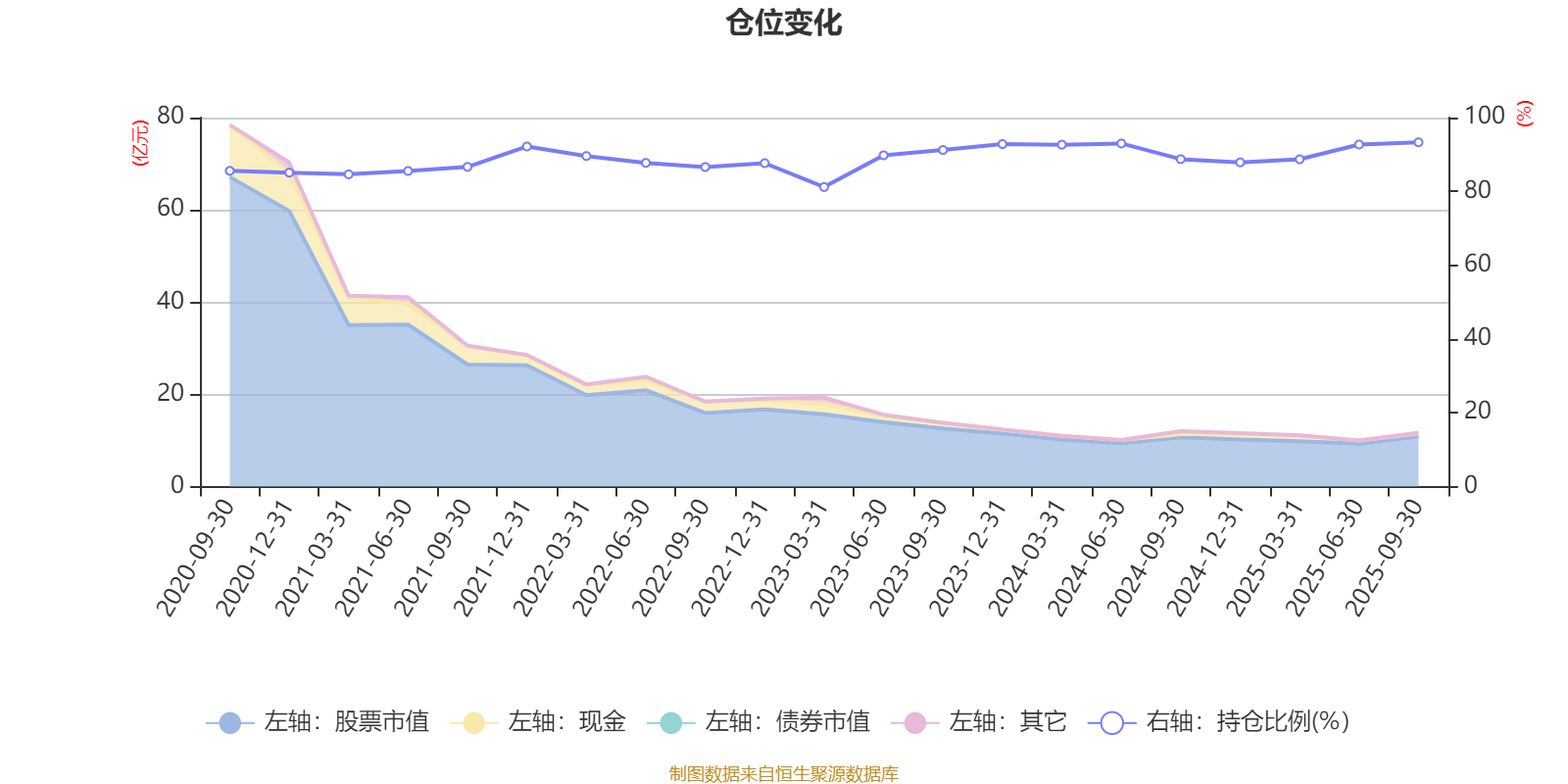 据定期报告数据统计,近三年平均股票仓位为89.97%,同类平均为85.84%。2025年三季度末基金达到93.3%的最高仓位,2023年一季度末最低,为81.19%。