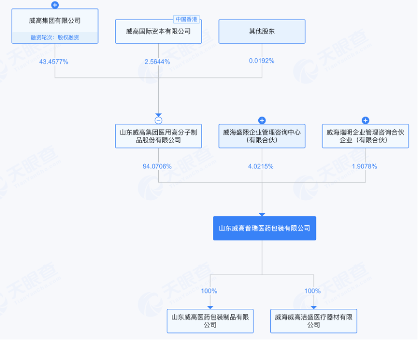 威高普瑞成立于2018年,注册资本约1.06亿元。公开信息显示,威高普瑞由港股上市公司威高股份持有94.07%股权,其余股权由威高集团旗下两家有限合伙企业持有,实际控制人与威高血净同为陈学利。威高普瑞主营预灌封注射器及药品给药系统,产品已延伸至自动注射笔、安全针具等一站式解决方案。