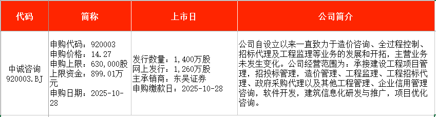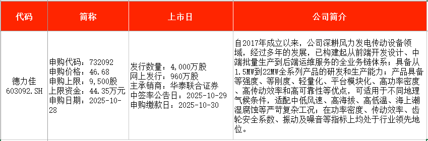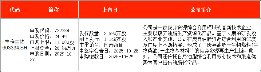 从时间表看,丰倍生物(603334)将在本周一(10月27日)申购;德力佳(603092)、中诚咨询(920003)均将在本周二(10月28日)申购。