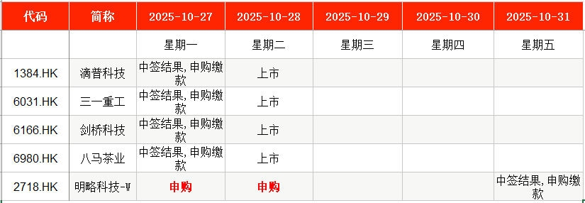 港股方面,Wind数据显示,本周(10月27日至10月31日)明略科技-W(02718.HK)将在周一至周二(10月27日至10月28日)申购。