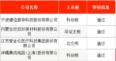 其中,拟在科创板上市的宁波健信超导科技股份有限公司(下称“健信超导”)、沐曦集成电路(上海)股份有限公司(下称“沐曦股份”),拟在深证主板上市的内蒙古双欣环保材料股份有限公司(下称“双欣环保”),以及拟在北交所上市的江苏爱舍伦医疗科技集团股份有限公司(下称“爱舍伦”)均成功过会。