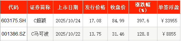 上周共有2只新股上市,分别为马可波罗控股股份有限公司(下称“马可波罗”,001386)、超颖电子电路股份有限公司(下称“超颖电子”,603175)。