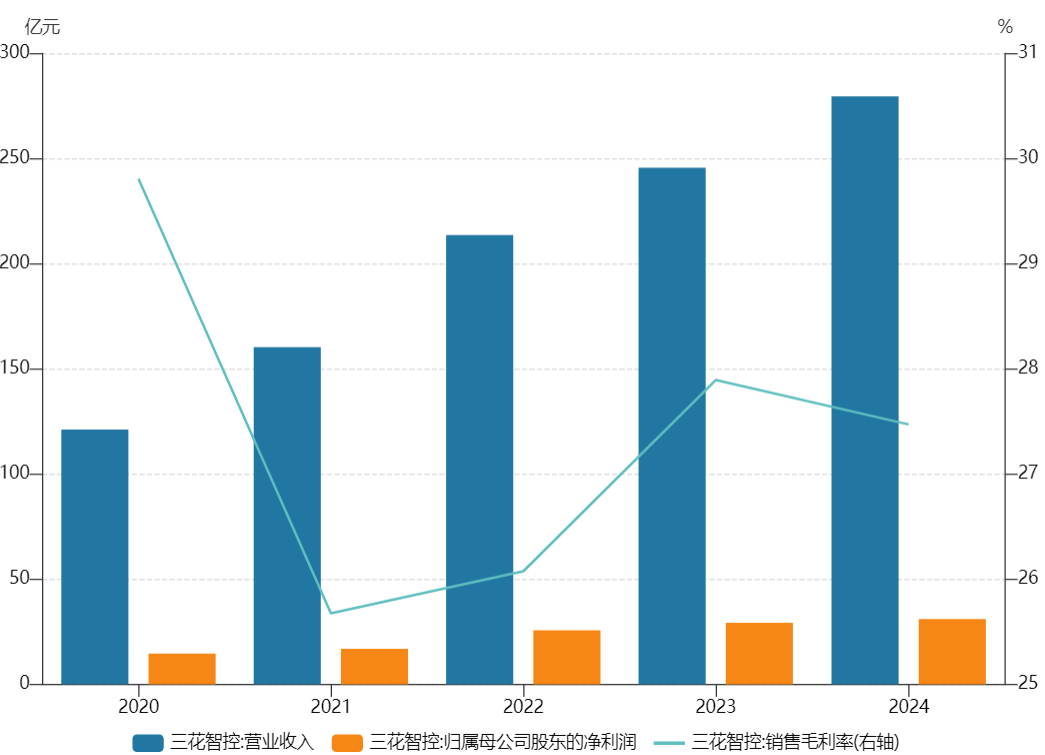 机构多持看好态度。据民生证券电新团队研报认为,三花智控依托电机制造经验和规模优势,成功切入仿生机器人机电执行器制造领域。公司持续优化产品轻量化与高精度性能,仿生机器人有望成为公司第三大核心增长极。中金公司研报认为,三花智控前瞻布局机器人关节总成业务,并配套核心客户储备产能。截至2024年底,公司机器人研发团队已超过180人,位于行业领先地位。