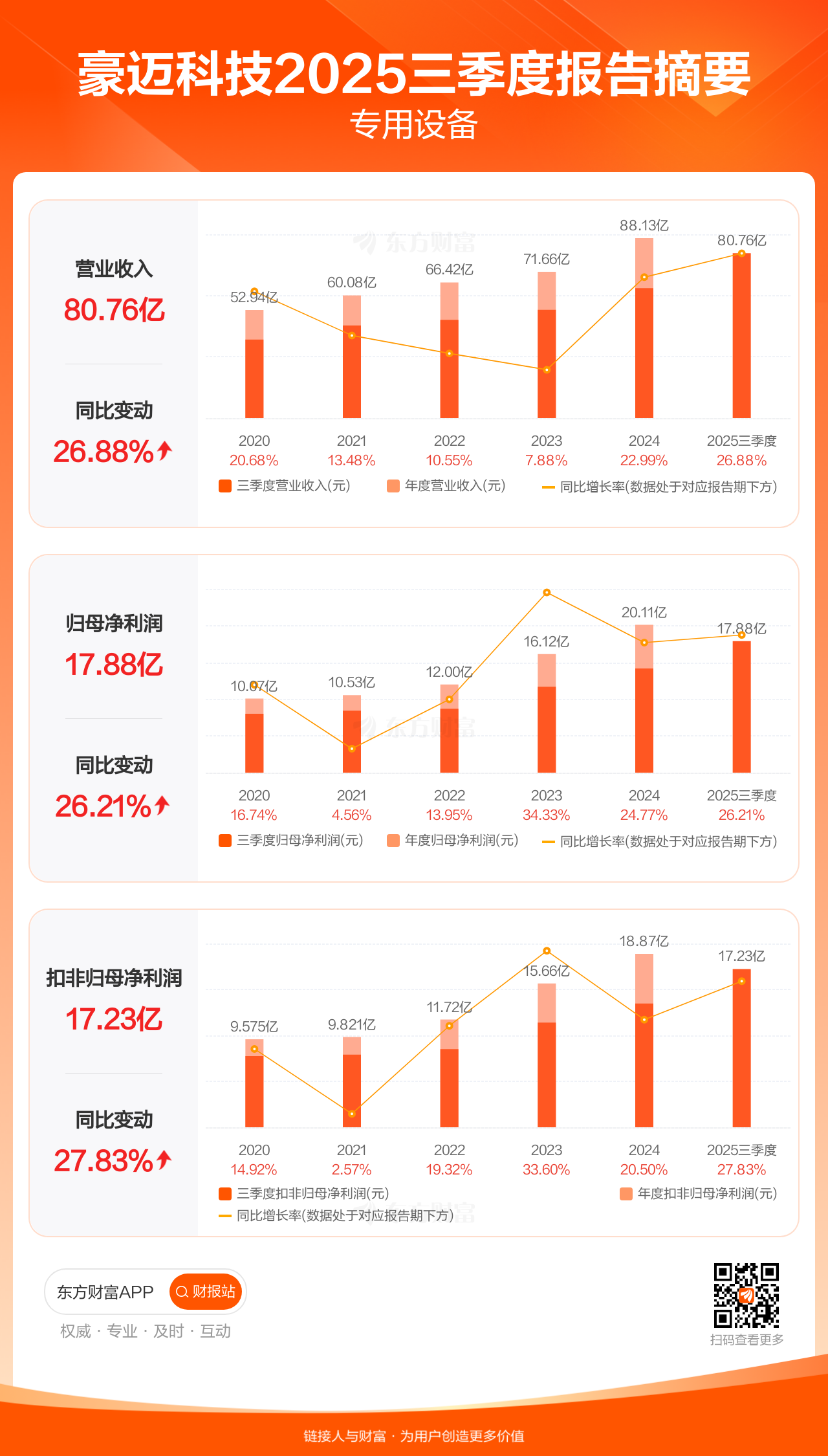 豪迈科技10月25日发布2025年三季报显示,公司前三季实现营业收入80.76亿元,同比增长26.88%;归母净利润17.88亿元,同比增长26.21%;扣非归母净利润17.23亿元,同比增长27.83%。