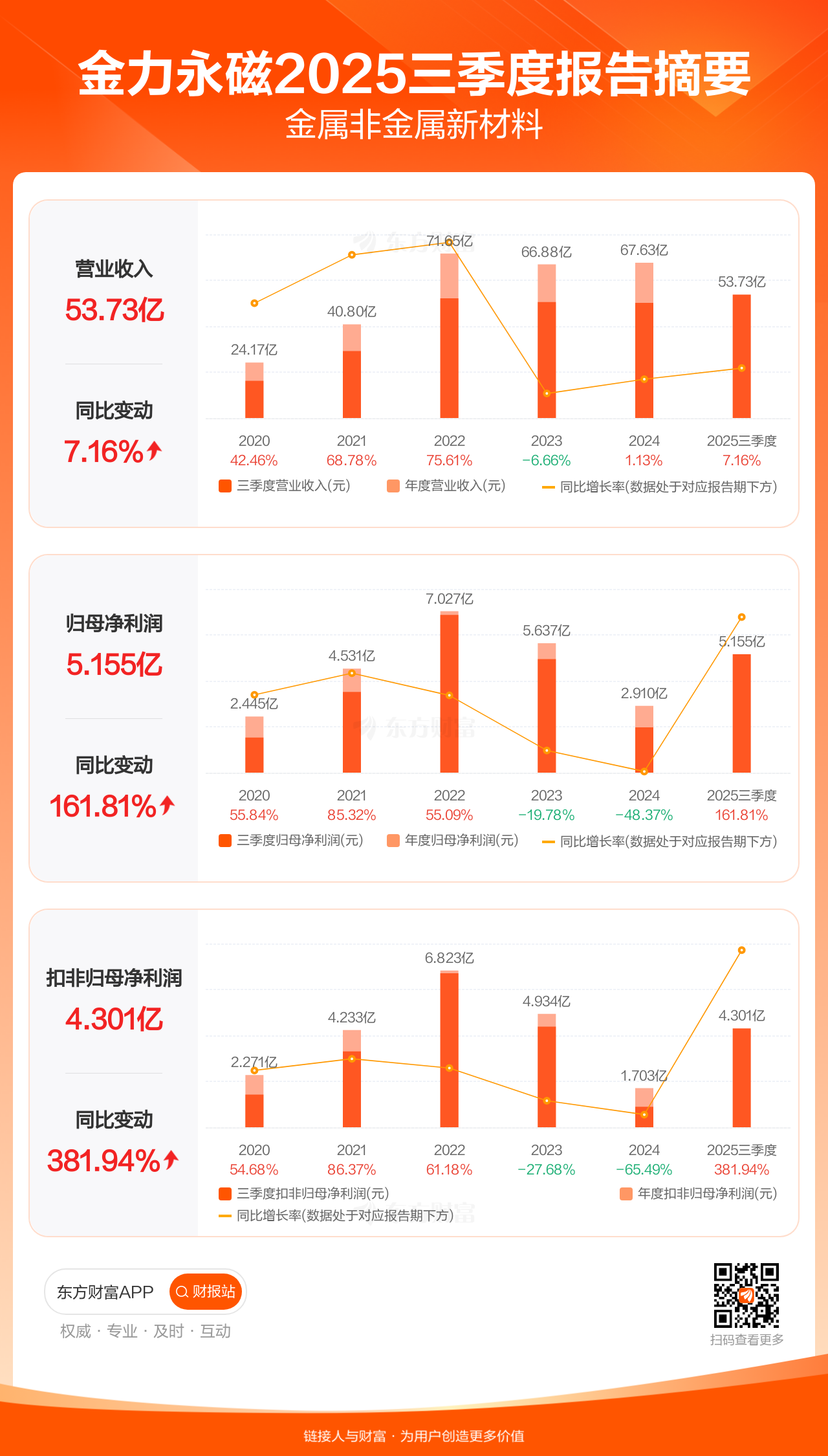 金力永磁10月21日发布2025年三季报显示,公司前三季实现营业收入53.73亿元,同比增长7.16%;归母净利润5.15亿元,同比增长161.81%;扣非归母净利润4.30亿元,同比增长381.94%。