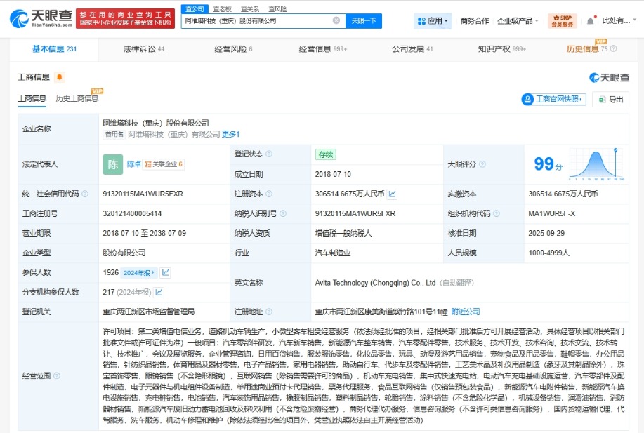 天眼查App显示,近日,阿维塔科技(重庆)股份有限公司发生工商变更,朱华荣卸任董事长,由王辉接任。该公司成立于2018年7月,法定代表人为陈卓,注册资本约30.65亿人民币,经营范围含第二类增值电信业务、道路机动车辆生产、小微型客车租赁经营服务、汽车零部件研发、汽车新车销售、新能源汽车整车销售等。股东信息显示,该公司由长安汽车(000625)、宁德时代(300750)、重庆安渝私募股权投资基金合伙企业(有限合伙)等共同持股。据媒体报道,今年9月,阿维塔宣布王辉正式出任公司董事长,全面负责公司战略规划、经营管理及全球业务。