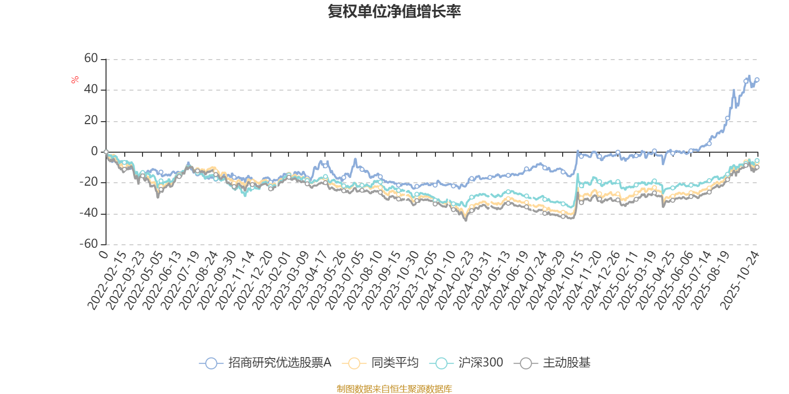 截至10月24日,招商研究优选股票A近三个月复权单位净值增长率为34.25%,位于同类可比基金10/167;近半年复权单位净值增长率为47.37%,位于同类可比基金24/166;近一年复权单位净值增长率为50.52%,位于同类可比基金17/164;近三年复权单位净值增长率为80.39%,位于同类可比基金6/156。