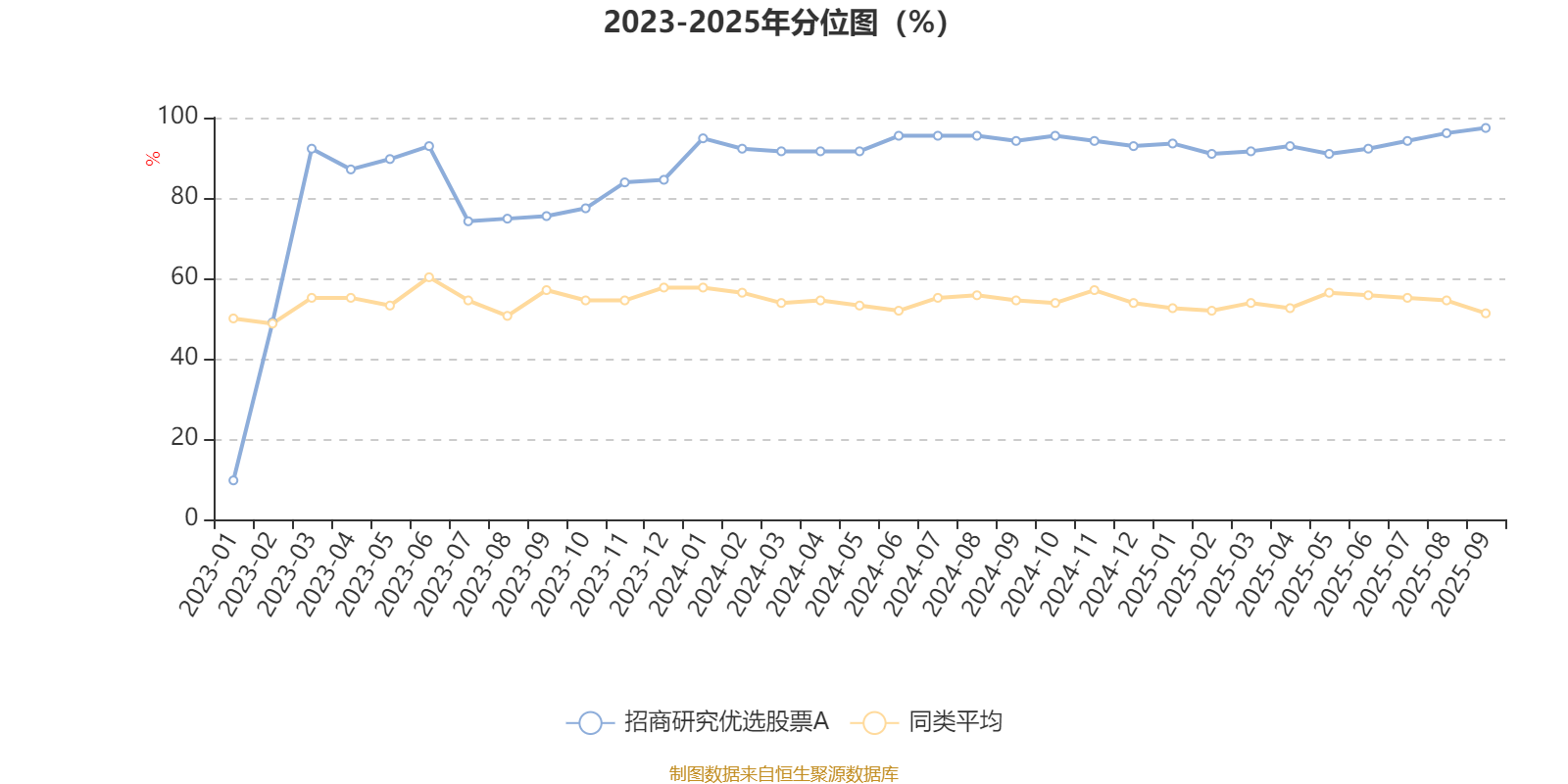 通过所选区间该基金净值增长率分位图,可以观察该基金与同类基金业绩比较情况。图为坐标原点到区间内某时点的净值增长率在同类基金中的分位数。