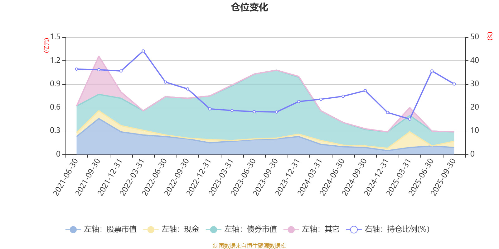 据定期报告数据统计,近三年平均股票仓位为22.66%,同类平均为72.16%。2022年一季度末基金达到44.2%的最高仓位,2025年一季度末最低,为15.12%。