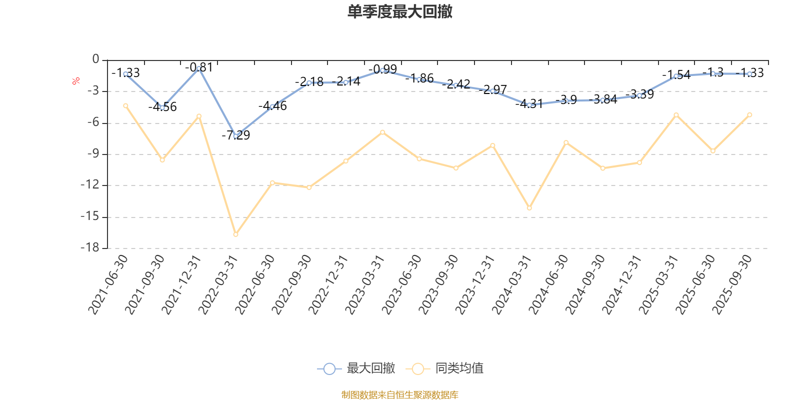 截至10月24日,基金近三年最大回撤为7.18%,同类可比基金排名113/1283。单季度最大回撤出现在2022年一季度,为7.29%。