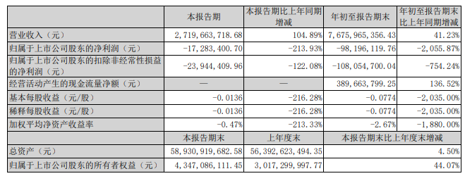 其中,第三季度,公司营业收入为27.20亿元,同比增长104.89%;归母净利润为-1728.34万元,同比下降213.93%;扣非归母净利润为-2394.44万元,同比下降122.08%。