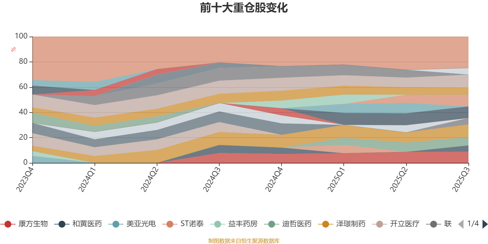 该基金持股集中度较高,近2年前十大重仓股集中度长期超过60%。截至2025年三季度末,基金十大重仓股分别是佰仁医疗、泽璟制药、迈威生物、康诺亚-B、康方生物、迪哲医药、恒瑞医药、汇宇制药、联邦制药、和黄医药。