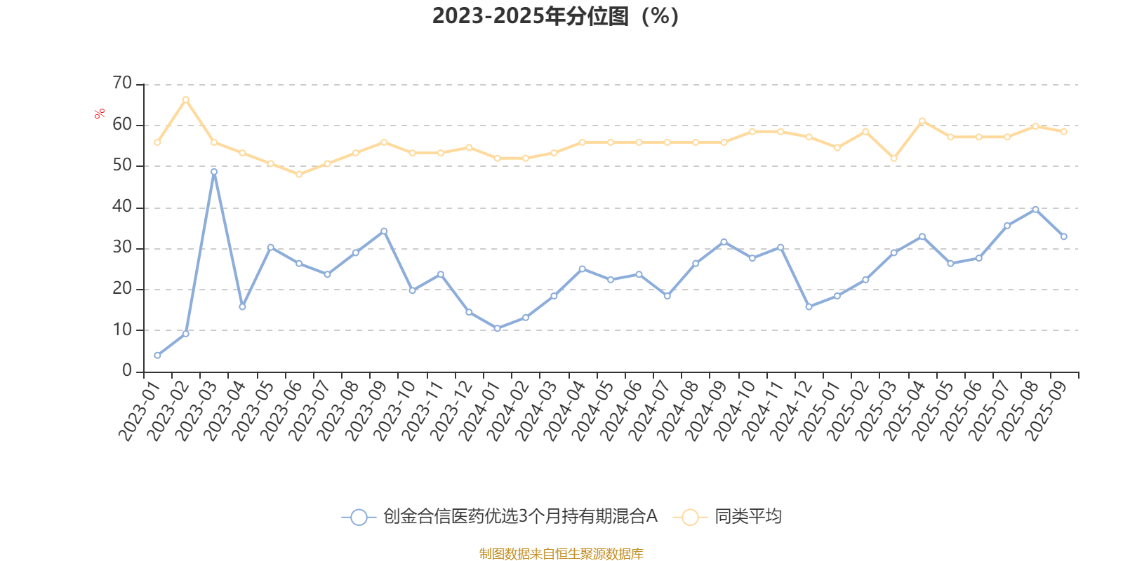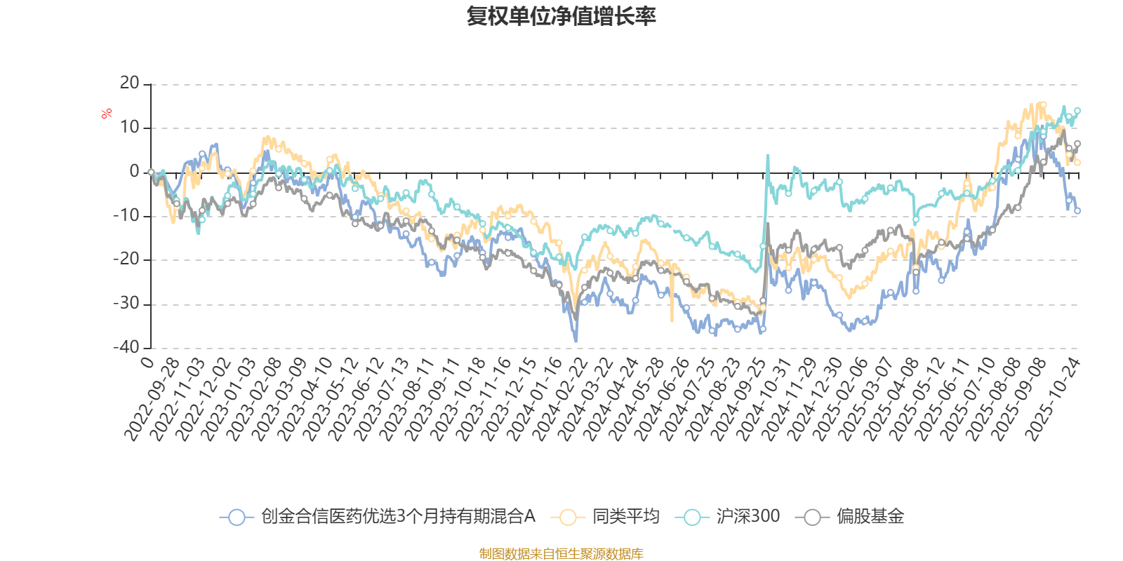 截至10月24日,创金合信医药优选3个月持有期混合A近三个月复权单位净值增长率为-7.38%,位于同类可比基金76/106;近半年复权单位净值增长率为11.30%,位于同类可比基金93/104;近一年复权单位净值增长率为19.79%,位于同类可比基金69/101;近三年复权单位净值增长率为-9.90%,位于同类可比基金59/75。