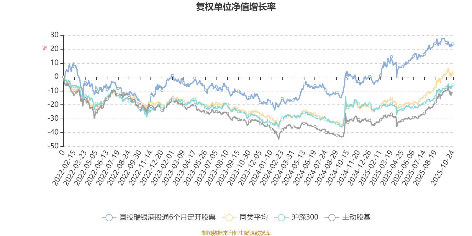 截至10月24日,国投瑞银港股通6个月定开股票近三个月复权单位净值增长率为2.37%,位于同类可比基金53/58;近半年复权单位净值增长率为15.12%,位于同类可比基金48/57;近一年复权单位净值增长率为22.67%,位于同类可比基金39/57;近三年复权单位净值增长率为66.23%,位于同类可比基金7/56。