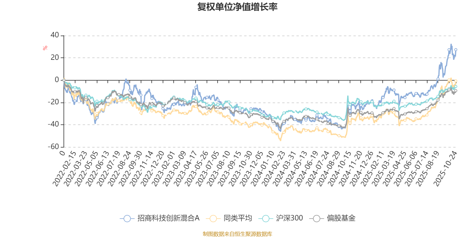 截至10月24日,招商科技创新混合A近三个月复权单位净值增长率为38.24%,位于同类可比基金105/229;近半年复权单位净值增长率为48.81%,位于同类可比基金115/229;近一年复权单位净值增长率为63.61%,位于同类可比基金65/213;近三年复权单位净值增长率为45.20%,位于同类可比基金75/158。