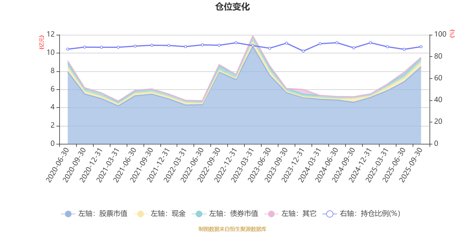 据定期报告数据统计,近三年平均股票仓位为89.86%,同类平均为86.74%。2024年上半年末基金达到92.77%的最高仓位,2023年末最低,为85.1%。