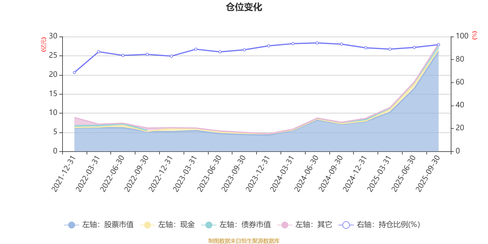 据定期报告数据统计,近三年平均股票仓位为90.32%,同类平均为87.54%。2024年上半年末基金达到94.47%的最高仓位,2021年末最低,为68.77%。