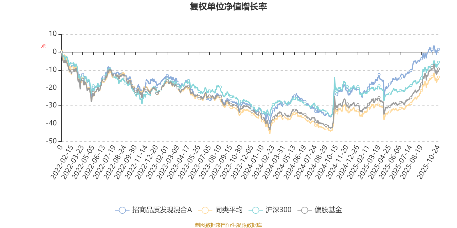截至10月24日,招商品质发现混合A近三个月复权单位净值增长率为6.66%,位于同类可比基金149/185;近半年复权单位净值增长率为23.39%,位于同类可比基金121/185;近一年复权单位净值增长率为30.65%,位于同类可比基金74/181;近三年复权单位净值增长率为29.33%,位于同类可比基金57/175。