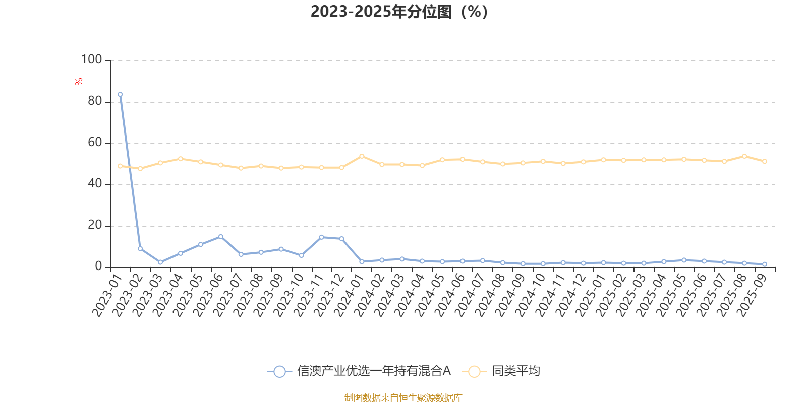 通过所选区间该基金净值增长率分位图,可以观察该基金与同类基金业绩比较情况。图为坐标原点到区间内某时点的净值增长率在同类基金中的分位数。