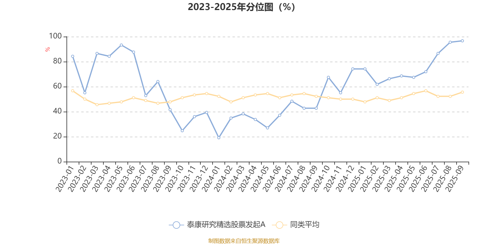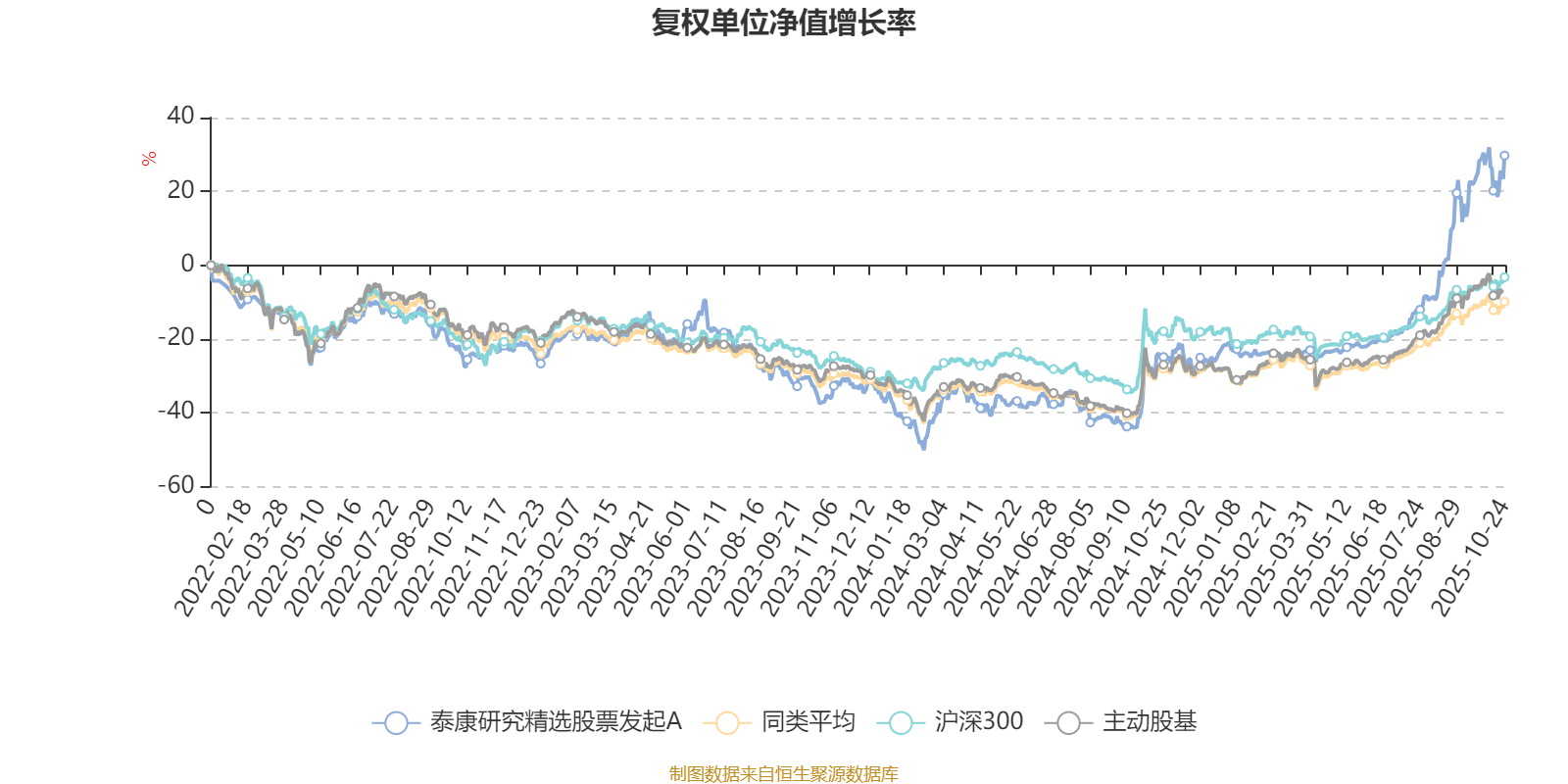 截至10月24日,泰康研究精选股票发起A近三个月复权单位净值增长率为47.54%,位于同类可比基金2/121;近半年复权单位净值增长率为68.59%,位于同类可比基金2/121;近一年复权单位净值增长率为73.62%,位于同类可比基金2/115;近三年复权单位净值增长率为73.00%,位于同类可比基金2/85。