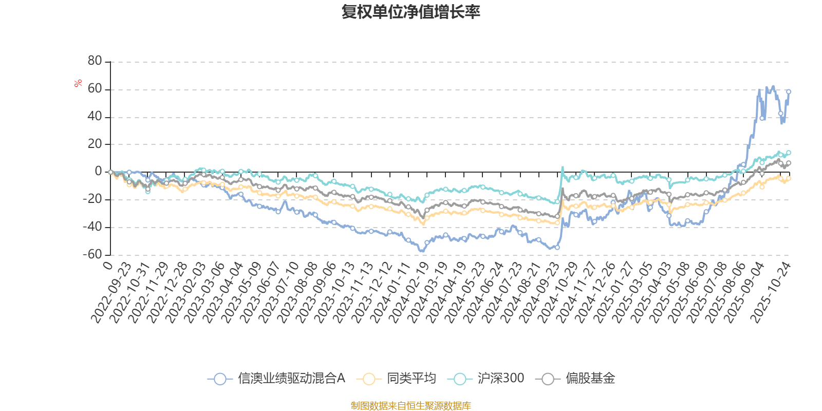 截至10月24日,信澳业绩驱动混合A近三个月复权单位净值增长率为68.46%,位于同类可比基金2/689;近半年复权单位净值增长率为159.94%,位于同类可比基金1/688;近一年复权单位净值增长率为124.56%,位于同类可比基金2/653;近三年复权单位净值增长率为63.31%,位于同类可比基金15/363。