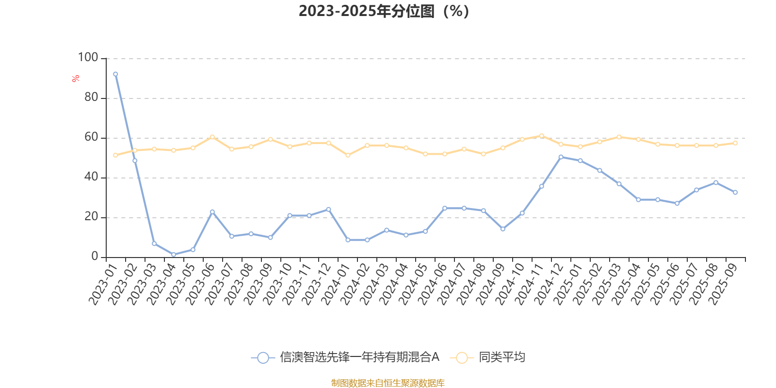 通过所选区间该基金净值增长率分位图,可以观察该基金与同类基金业绩比较情况。图为坐标原点到区间内某时点的净值增长率在同类基金中的分位数。