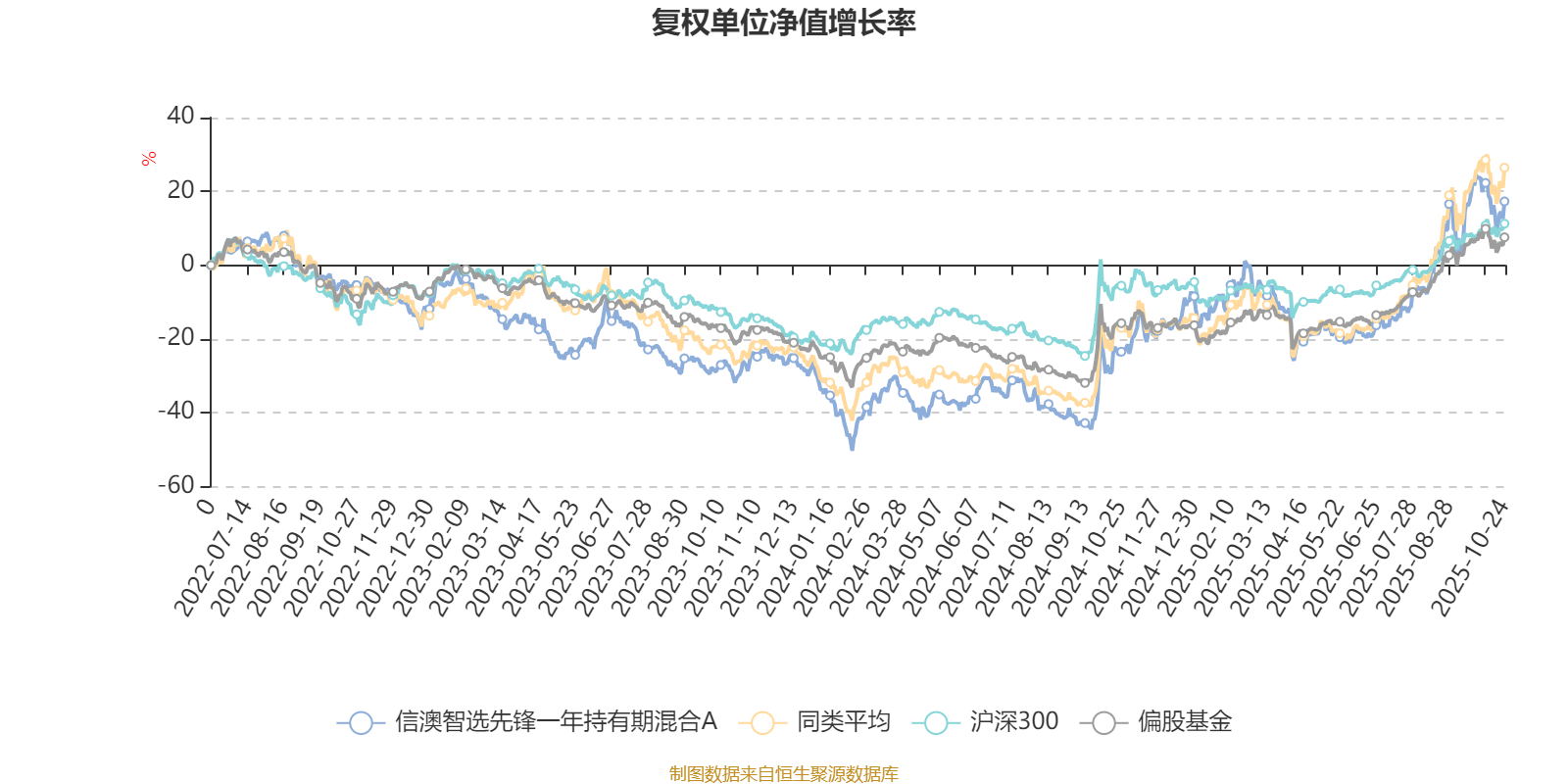 截至10月24日,信澳智选先锋一年持有期混合A近三个月复权单位净值增长率为32.64%,位于同类可比基金121/229;近半年复权单位净值增长率为44.59%,位于同类可比基金130/229;近一年复权单位净值增长率为54.90%,位于同类可比基金93/213;近三年复权单位净值增长率为24.52%,位于同类可比基金111/158。