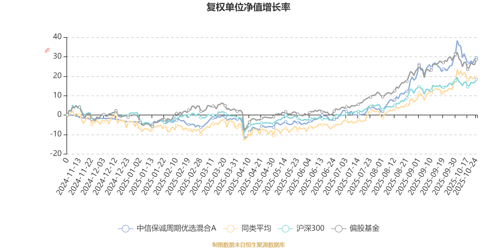 截至10月24日,中信保诚周期优选混合A近三个月复权单位净值增长率为24.41%,位于同类可比基金11/49;近半年复权单位净值增长率为38.21%,位于同类可比基金21/49。