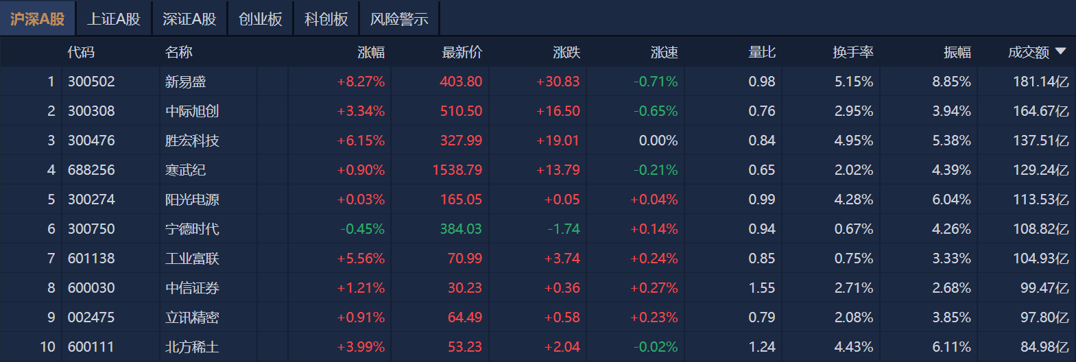 个股方面,新易盛成交额超181亿元居首,中际旭创、胜宏科技成交额靠前。