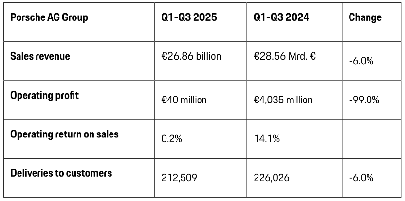 当地时间10月24日,德国大众集团旗下保时捷汽车公司发布的数据显示,公司前三季度销售收入约为268.6亿欧元,同比下降6%;经营利润仅为4000万欧元,较去年同期的40.35亿欧元下降99%;销售回报率大幅降至0.2%,去年同期则为14.1%。