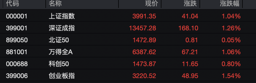 截至午间收盘,上证指数涨1.04%,报3991.35点;深证成指涨1.26%,报13457.28点;创业板指涨1.54%,报3220.52点;科创50指数涨0.8%;北证50指数涨0.05%。