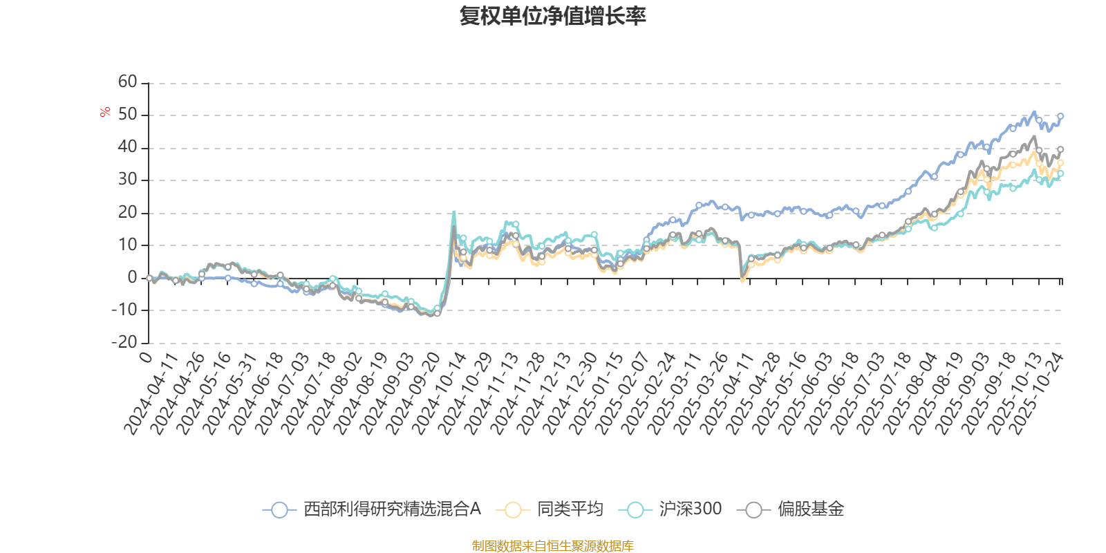 截至10月24日,西部利得研究精选混合A近三个月复权单位净值增长率为15.12%,位于同类可比基金282/689;近半年复权单位净值增长率为25.20%,位于同类可比基金357/688;近一年复权单位净值增长率为37.52%,位于同类可比基金175/653。