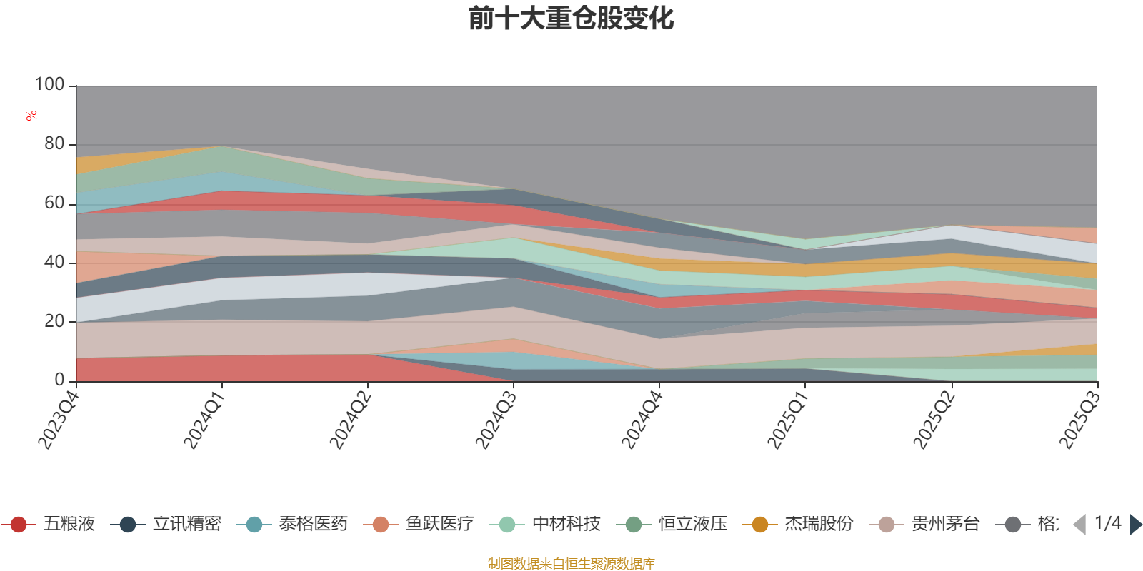 截至2025年三季度末,基金十大重仓股分别是贵州茅台、恒瑞医药、药明康德、三花智控、徐工机械、恒立液压、中材科技、福瑞股份、杰瑞股份、招商银行。