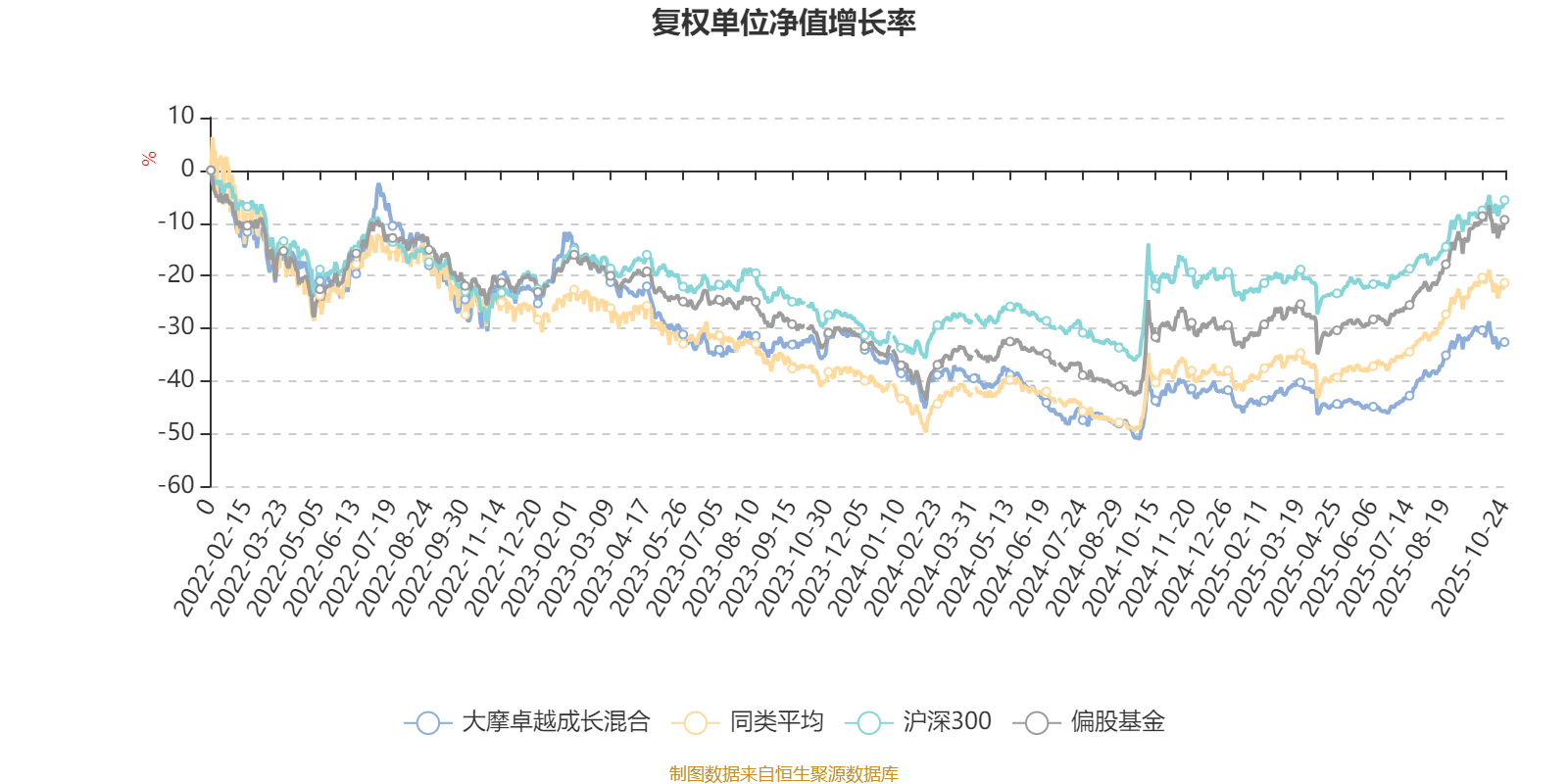截至10月24日,大摩卓越成长混合近三个月复权单位净值增长率为11.20%,位于同类可比基金378/621;近半年复权单位净值增长率为21.29%,位于同类可比基金427/618;近一年复权单位净值增长率为17.69%,位于同类可比基金456/611;近三年复权单位净值增长率为-5.09%,位于同类可比基金435/518。
