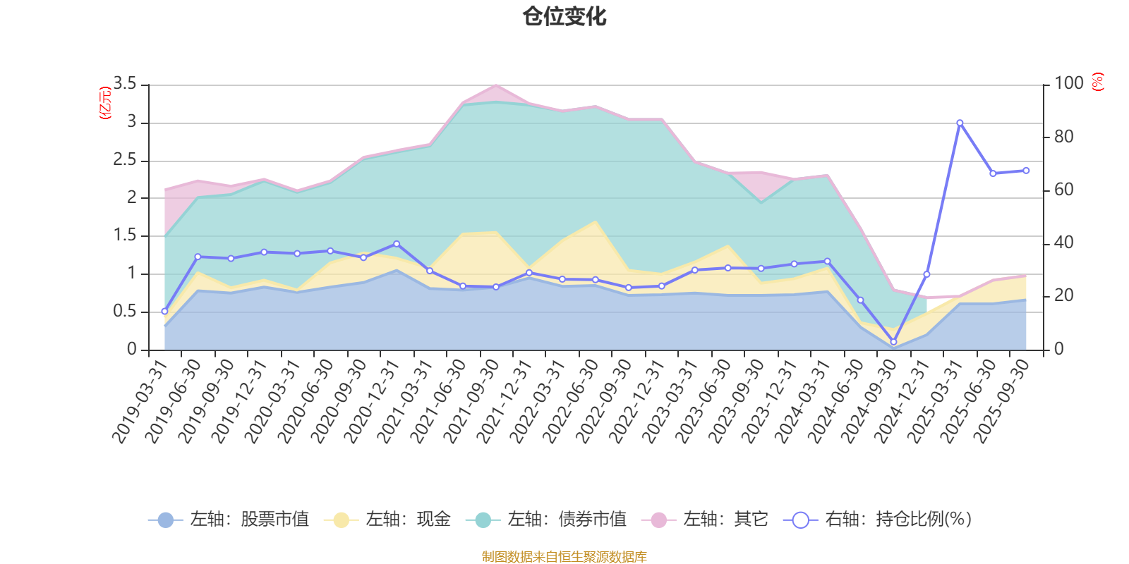 据定期报告数据统计,近三年平均股票仓位为37.67%,同类平均为72.16%。2025年一季度末基金达到85.6%的最高仓位,2024年三季度末最低,为3.08%。