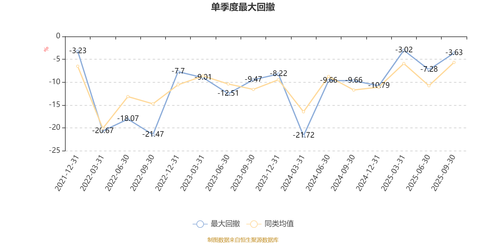 截至10月24日,基金近三年最大回撤为34.8%,同类可比基金排名239/519。单季度最大回撤出现在2024年一季度,为21.72%。
