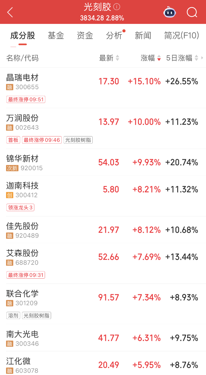 光刻机、光刻胶概念股早盘一度领涨两市。彤程新材早盘一度涨停,晶瑞电材涨超15%,南大光电、上海新阳等多股高开。消息面上,近日北京大学化学与分子工程学院彭海琳教授团队及合作者通过冷冻电子断层扫描技术,首次在原位状态下解析了光刻胶分子在液相环境中的微观三维结构、界面分布与缠结行为,指导开发出可显著减少光刻缺陷的产业化方案。