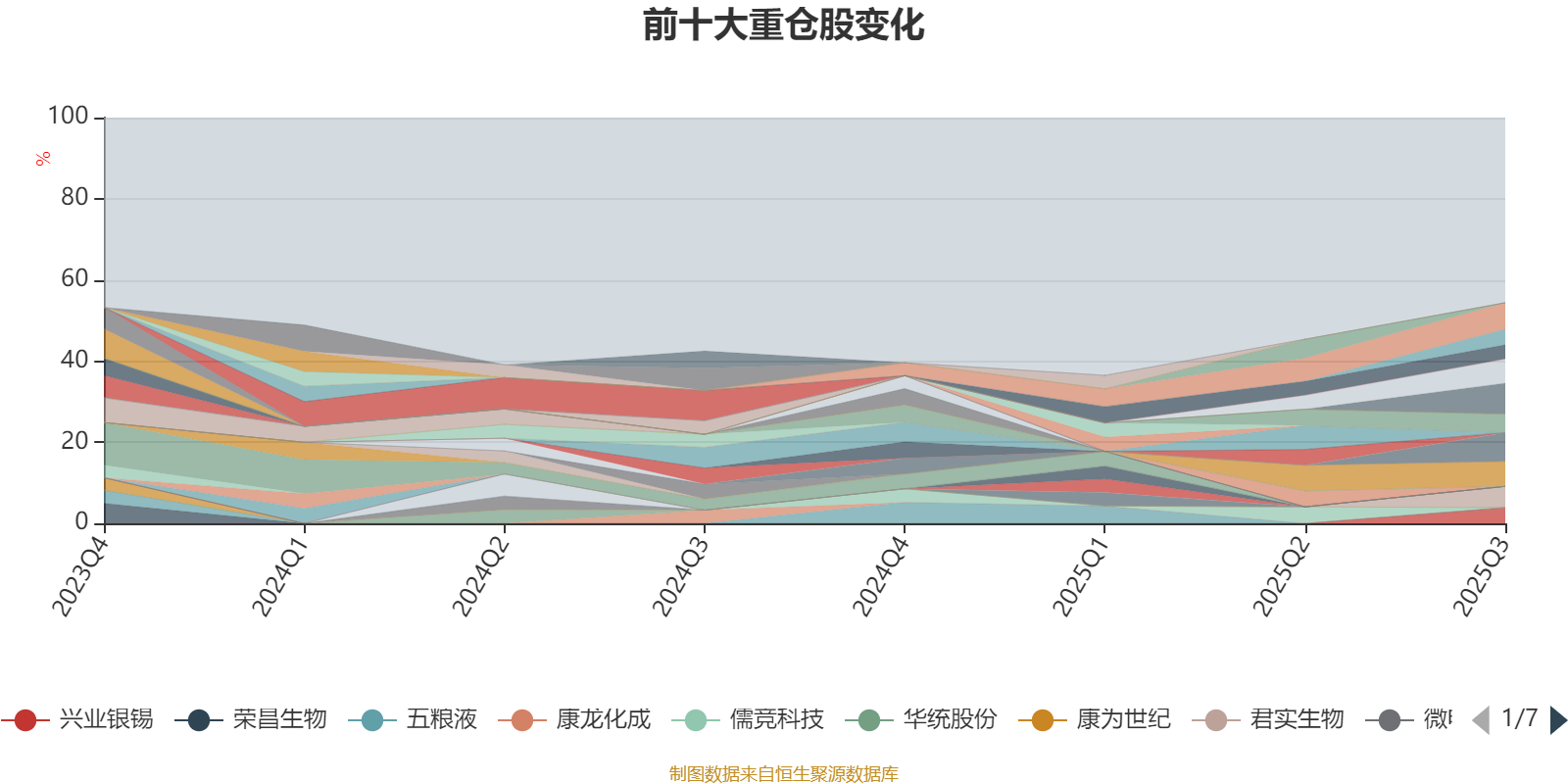 截至2025年三季度末,基金十大重仓股分别是恒瑞医药、药明康德、若羽臣、潮宏基、莱绅通灵、君实生物、乐普医疗、兴业银锡、益方生物、万辰集团。