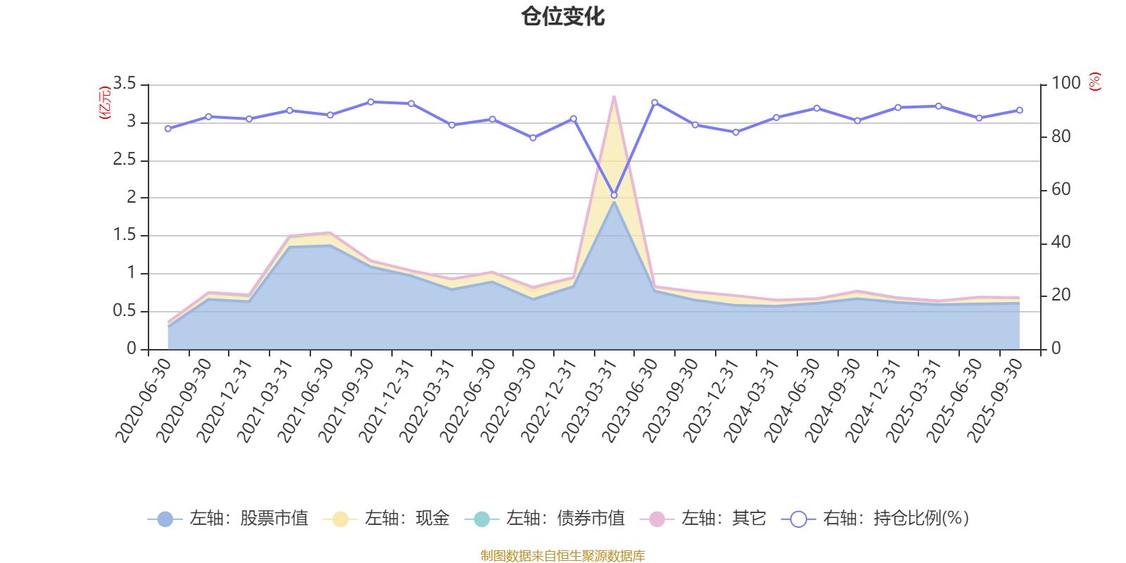 据定期报告数据统计,近三年平均股票仓位为85.91%,同类平均为88.11%。2021年三季度末基金达到93.41%的最高仓位,2023年一季度末最低,为58.19%。
