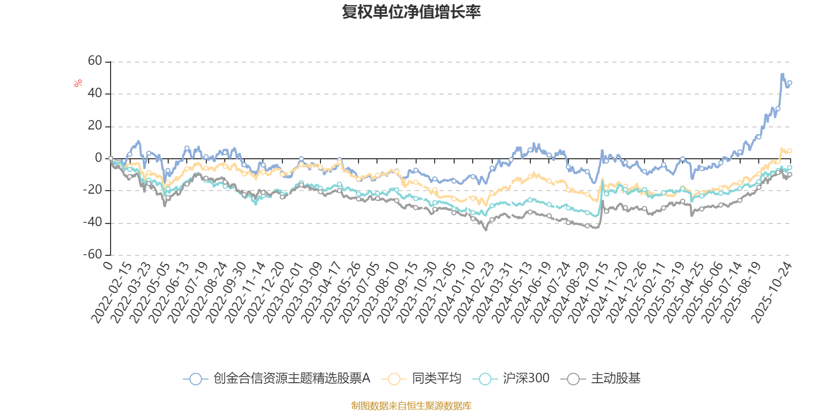 截至10月24日,创金合信资源主题精选股票A近三个月复权单位净值增长率为32.67%,位于同类可比基金2/13;近半年复权单位净值增长率为57.03%,位于同类可比基金3/13;近一年复权单位净值增长率为45.37%,位于同类可比基金3/12;近三年复权单位净值增长率为60.78%,位于同类可比基金4/9。