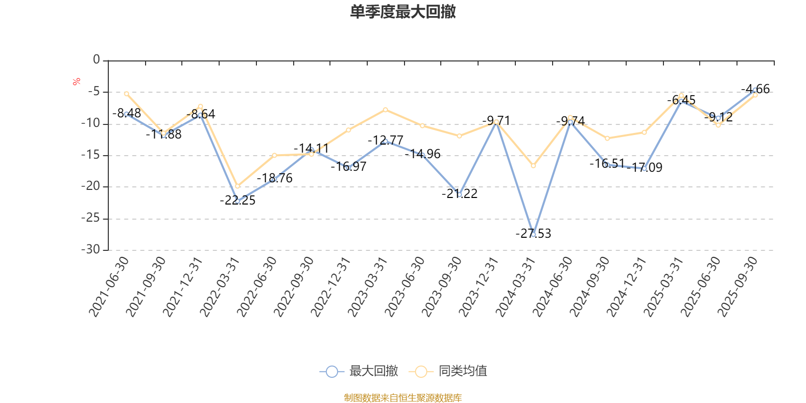 截至10月24日,基金近三年最大回撤为42.49%,同类可比基金排名65/85。单季度最大回撤出现在2024年一季度,为27.53%。