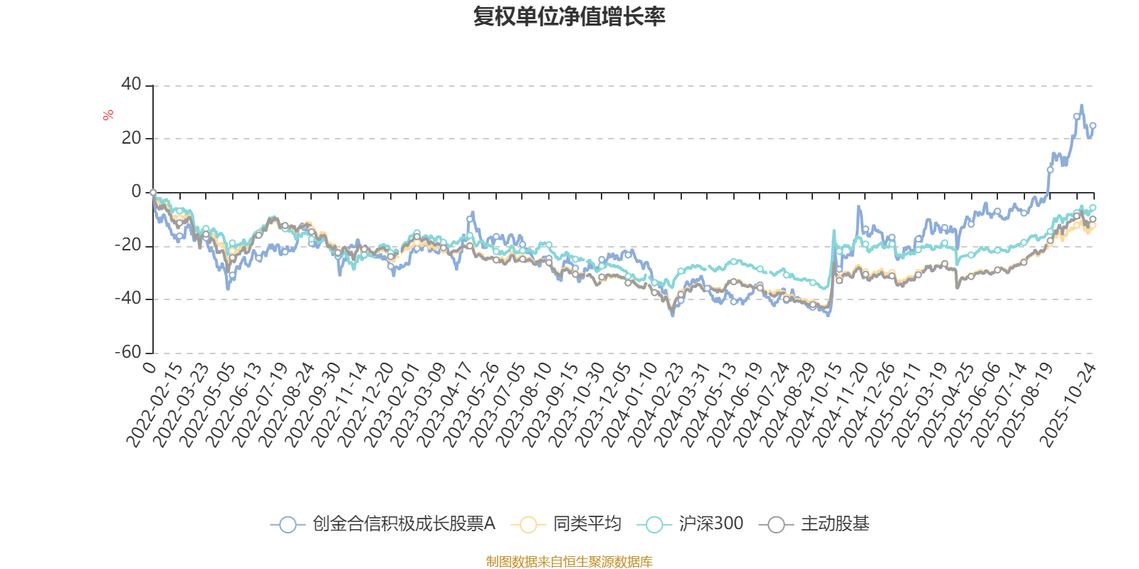 截至10月24日,创金合信积极成长股票A近三个月复权单位净值增长率为29.92%,位于同类可比基金10/121;近半年复权单位净值增长率为40.66%,位于同类可比基金23/121;近一年复权单位净值增长率为65.87%,位于同类可比基金3/115;近三年复权单位净值增长率为57.11%,位于同类可比基金9/85。