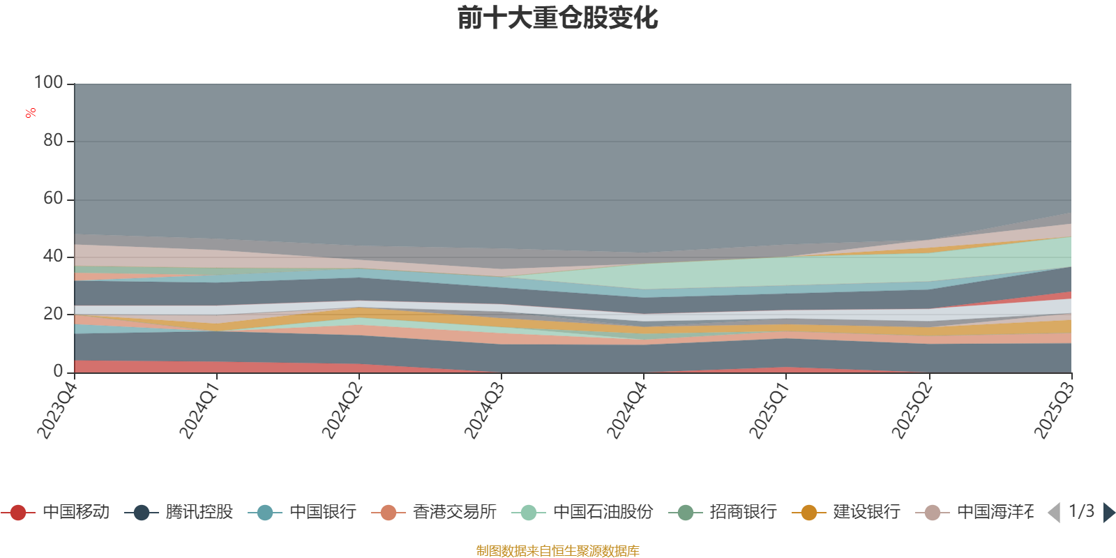 截至2025年三季度末,基金十大重仓股分别是阿里巴巴-W、腾讯控股、汇丰控股、小米集团-W、建设银行、友邦保险、美团-W、香港交易所、中芯国际、中国海洋石油。