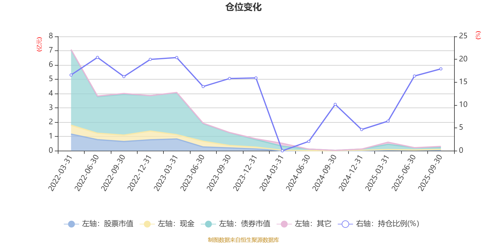 据定期报告数据统计,近三年平均股票仓位为11.98%,同类平均为19.03%。2022年上半年末基金达到20.42%的最高仓位,2024年上半年末最低,为2.06%。